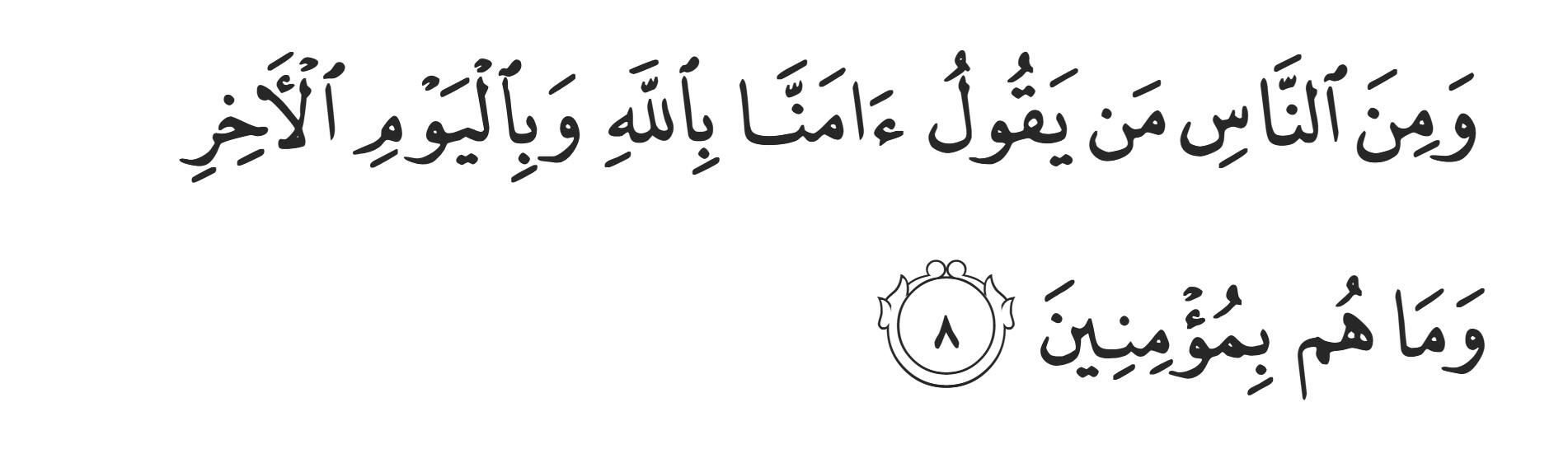 2:8. And of mankind, there are some who say: "We believe in Allah and the Last Day" while in fact they do not believe.