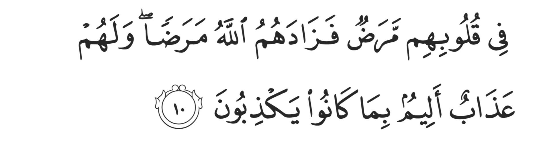 2:10. In their hearts is a disease and Allah has increased their disease. A painful torment is theirs because they used to tell lies.