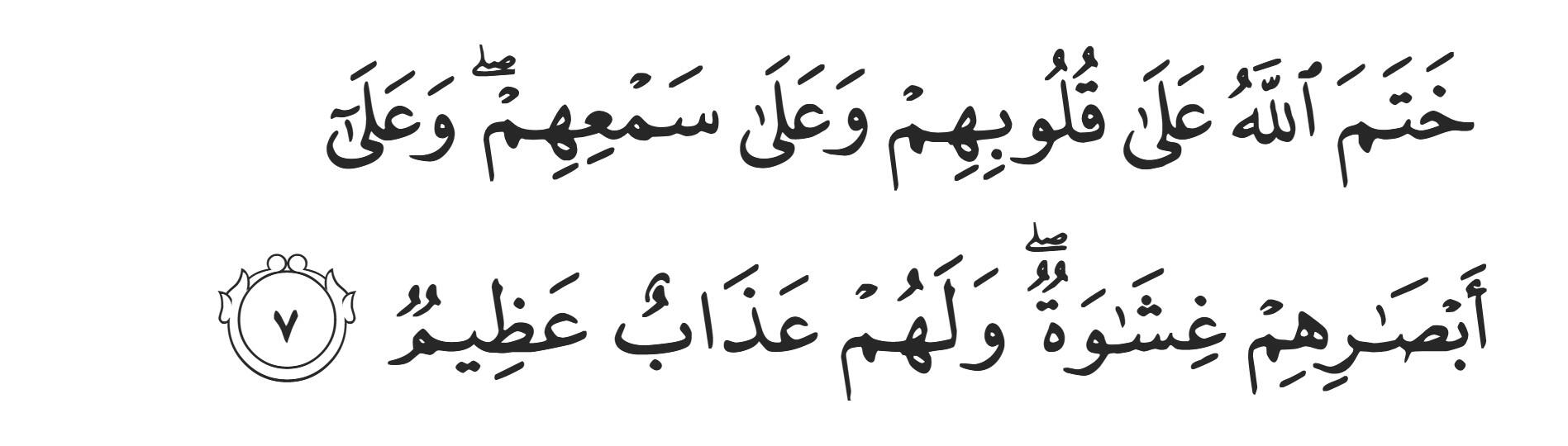 2:7. Allah has set a seal on their hearts and on their hearing, and on their eyes there is a covering. Theirs will be a great torment.